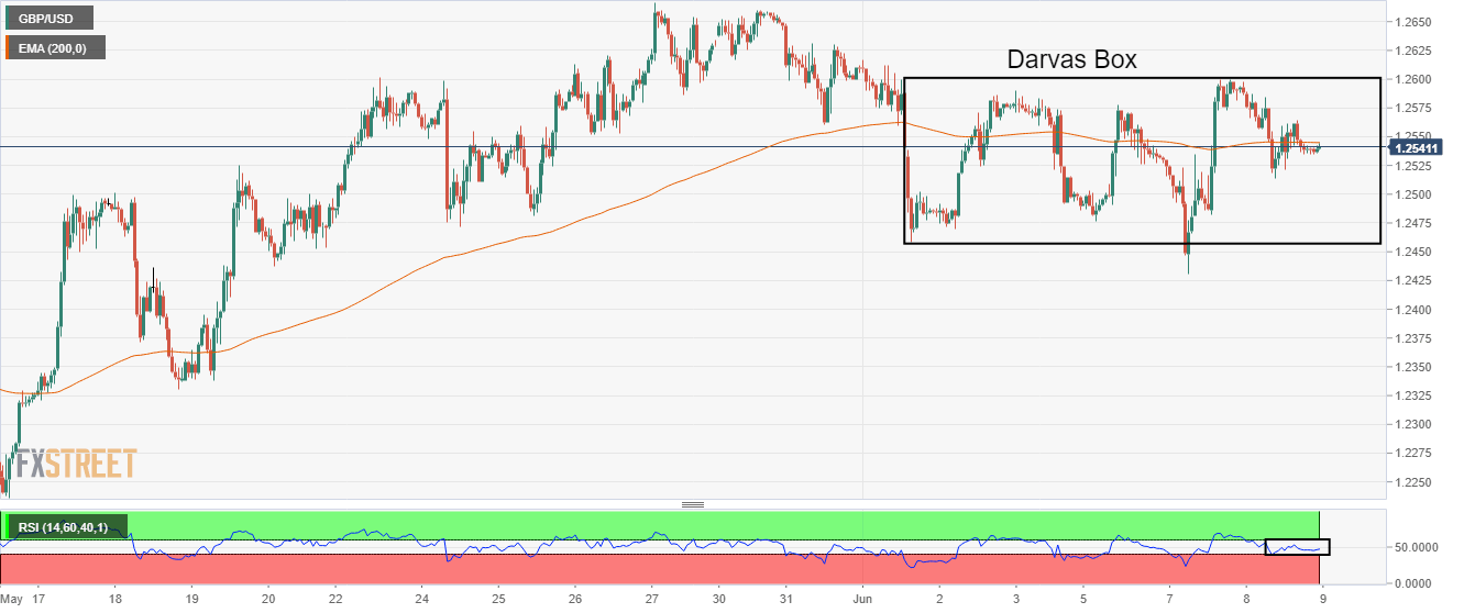 The 200-period Exponential Moving Average (EMA) at 1.2544 is overlapping with the cable price, which firms the odds of consolidation ahead.