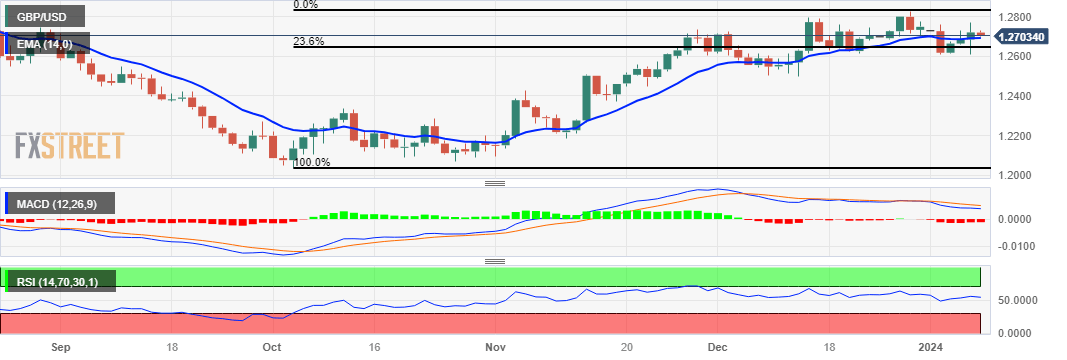 GBP/USD halts its three-day winning streak, trading around 1.2700 psychological level during the Asian session on Monday. The GBP/USD pair seems to face a critical juncture, with the possibility of a break below the psychological level. If this occurs, it could surpass the 14-day Exponential Moving Average (EMA) at 1.2692.