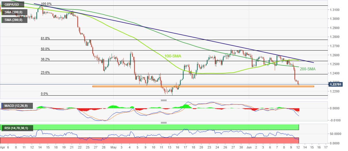 However, oversold RSI (14) can join multiple levels marked since May 09 to challenge the pair’s further downside around 1.2260-50.