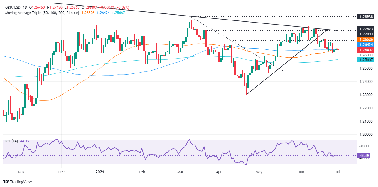 The Pound Sterling erased earlier gains during Monday’s session against the Greenback, even though US economic data showed the economy is slowing down. Per the market’s reaction to the data, it could be seen that worries about a recession in the US loom as US equities tumbled, along with the US Dollar, as market participants await US jobs data on Friday. The GBP/USD trades at 1.2643, down 0.01%.