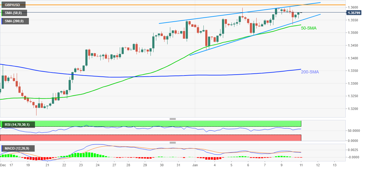 In doing so, the cable pair picks up bids inside short-term ascending triangle formation. However, steady RSI and sluggish MACD joins the pair’s failures to stay beyond 1.3600 keep sellers hopeful.