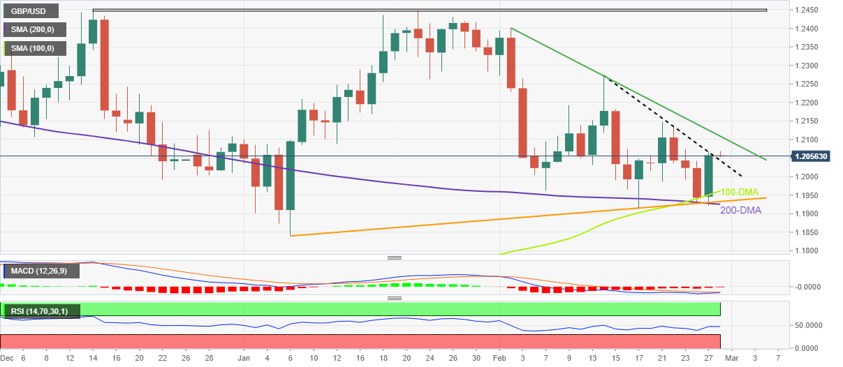 Even if the quote drops below 1.2040, the 100-DMA and 200-DMA, respectively near 1.1960 and 1.1920, could challenge the GBP/USD bears. Also acting as a downside filter is an upward-sloping support line from early January, close to 1.1930 by the press time.