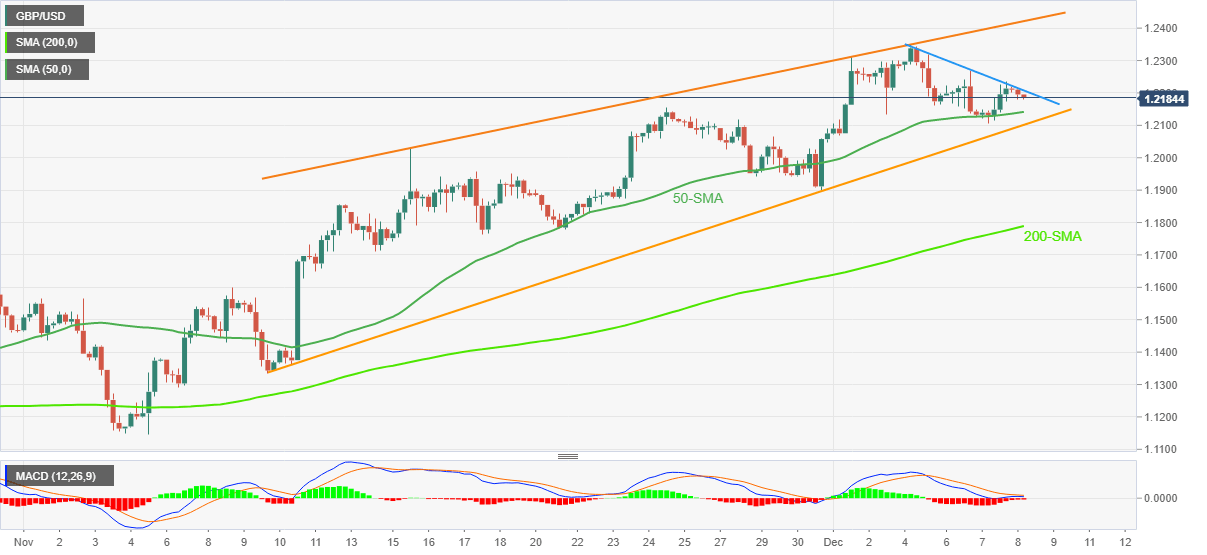 GBP/USD renews its intraday low near 1.2180 as it braces for the first weekly loss in five during early Thursday. In doing so, the Cable pair defends the bears by trading below a one-week-old descending resistance line, as well as inside a one-month-old rising wedge bearish chart formation.