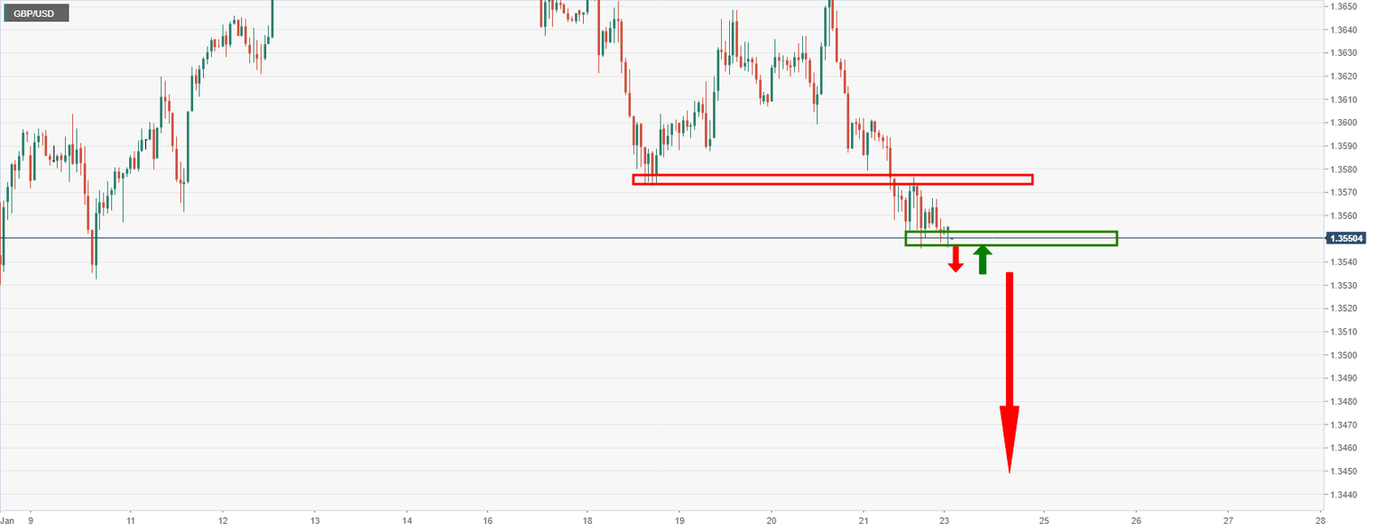 As per the prior analysis, GBP/USD Price Analysis: Bears eye a trip to 1.3450 as per weekly chart, cable has indeed move din on the target area as follows: