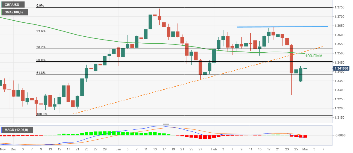 However, a daily closing below the 61.8% Fibonacci retracement (Fibo.) of December-January upside, around 1.3385, becomes necessary to aim for February’s low near 1.3275, with the 1.3300 likely acting as a buffer.