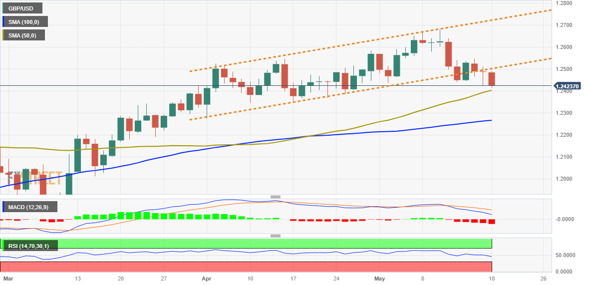 From a technical perspective, the emergence of fresh selling around the GBP/USD pair on Thursday reaffirms the recent break through the lower end of over a one-month-old ascending trend channel. Moreover, oscillators on the daily chart have started drifting in the bearish territory and add credence to the negative outlook. That said, it will be prudent to wait for some follow-through weakness below the 1.2400 mark, or the 50-day Simple Moving Average (SMA), before placing fresh bearish bets.