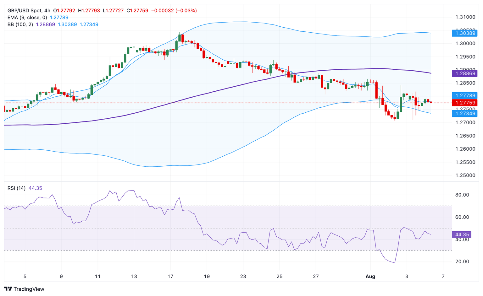 The lower limit of the Bollinger Band at 1.2735 acts as an initial support level for GBP/USD. A breach of this level will expose the 1.2700-1.2710 region, portraying a low of August 2 and a psychological mark. The additional downside filter to watch is 1.2615, a low of July 2.