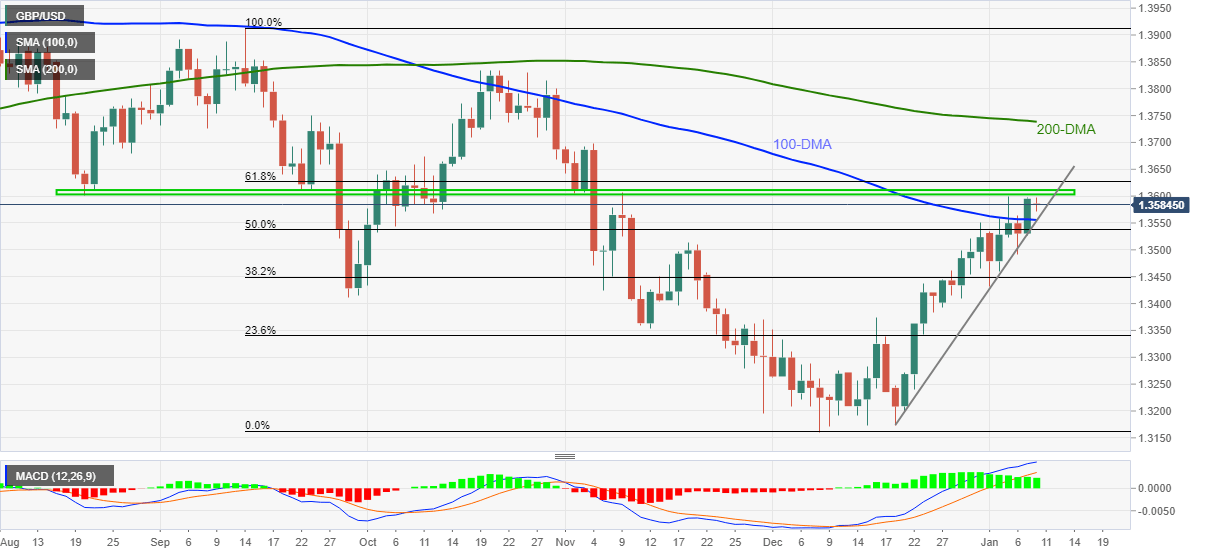 However, a clear upside break of the 100-DMA and a three-week-long uptrend, portrayed by the short-term support line, join the bullish MACD signals to favor buyers battling the 1.3600-3610 resistance zone.