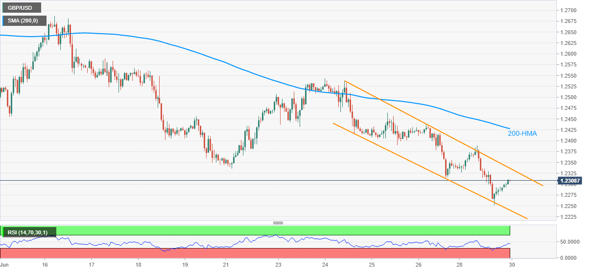GBP/USD takes rounds to 1.2305 during the early Asian session on Tuesday. The pair bounced off the lowest since May 28 the previous day. However, a four-day-old descending trend channel formation continues to portray the quote’s weakness.