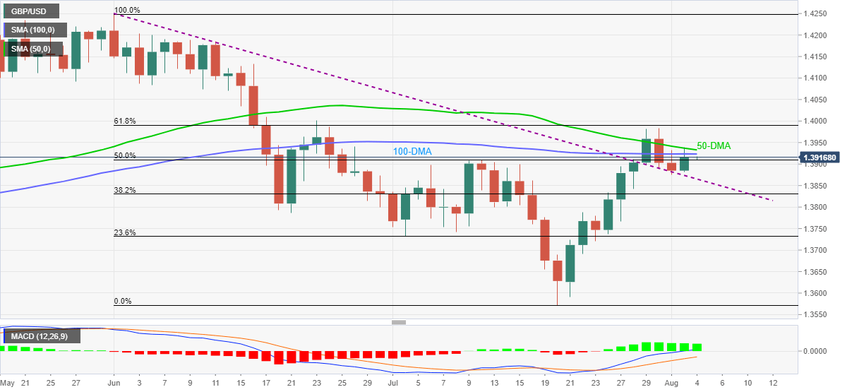 GBP/USD seesaws around 1.3920-15 amid the initial Asian session on Wednesday. In doing so, the cable takes rounds to 50.0% Fibonacci retracement (Fibo.) of June–July downturn while keeping the previous day’s rebound from the resistance-turned-support line from June 01.