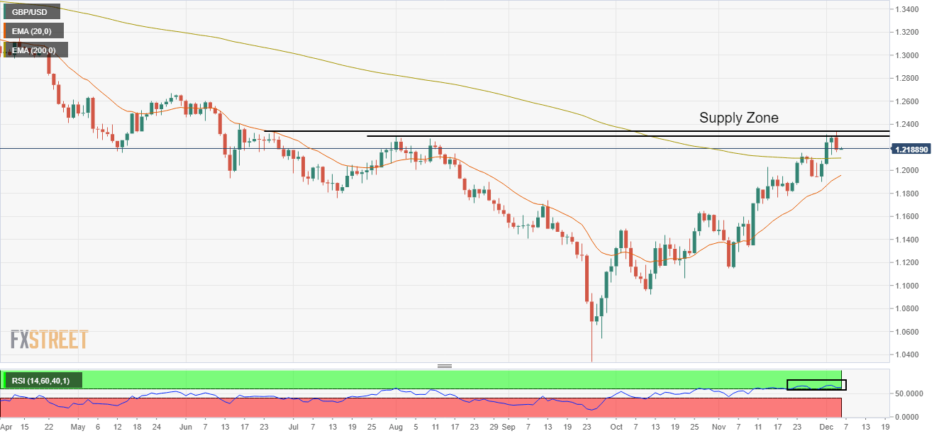 On a daily scale, Cable has faced selling pressure after testing the supply zone placed in a narrow range of 1.2292-1.2351. The gap between the Cable and the 20-period Exponential Moving Average (EMA) has escalated, therefore, a mean reversion cannot be ruled out. The Cable is still holding the 200-EMA at 1.2108, which indicates that the long-term trend is still bullish.