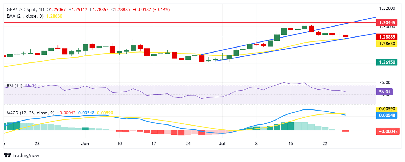 GBP/USD continues to lose ground for the third successive session, trading around 1.2890 during the Asian hours on Thursday. The analysis of the daily chart shows the pair consolidates within an ascending channel, signaling a bullish bias for the pair's price movements.