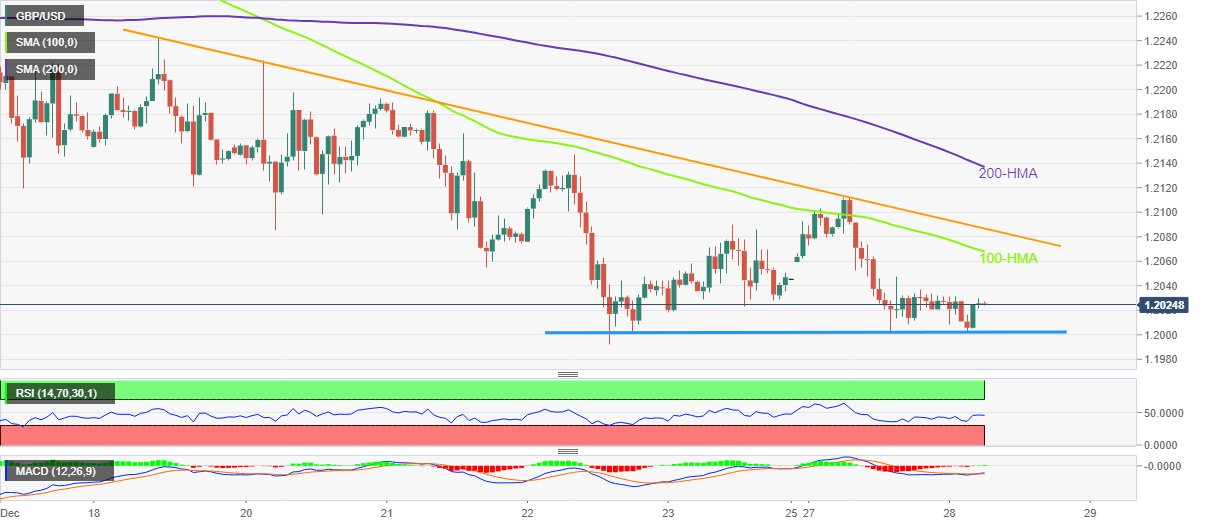 Although one-week-old horizontal support near 1.2000 restricts the immediate downside of the GBP/USD pair, recovery remains elusive unless the quote crosses a downward-sloping resistance line from December 19, close to 1.2090 by the press time.