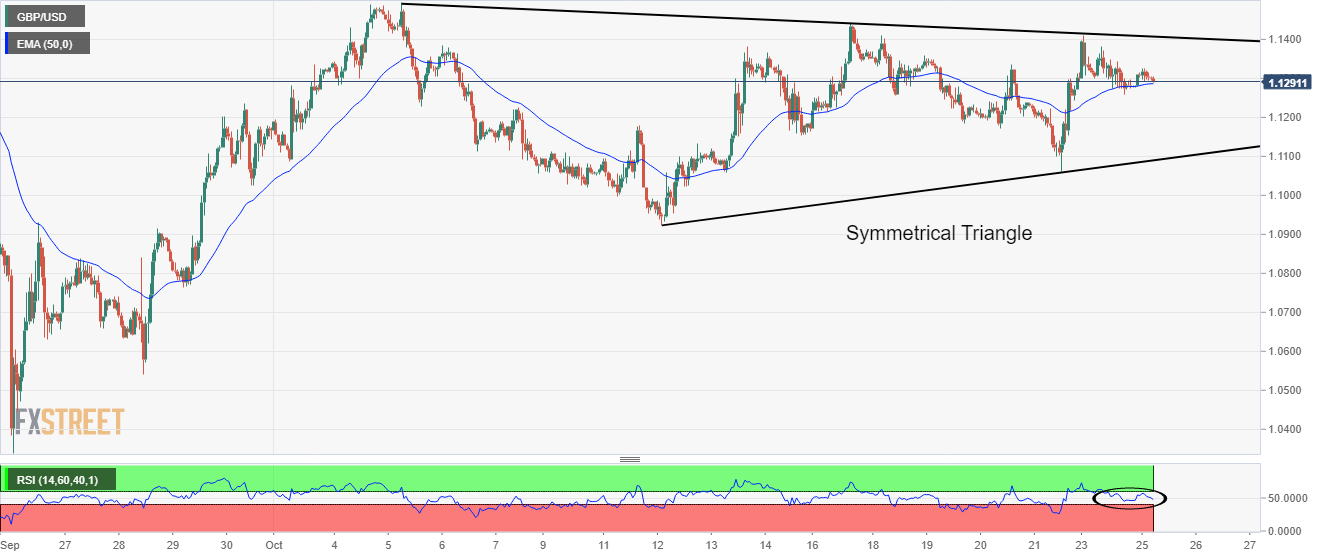 On an hourly scale, the cable is oscillating in a Symmetrical Triangle chart pattern that signals a volatility contraction. The upward-sloping trendline of the chart pattern is placed from October 12 low at 1.0924 while the downward-sloping trendline is plotted from October 5 high at 1.1496.
