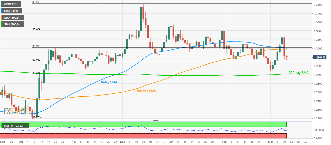 While extending its fall below 50-day and 100-day SMA, GBP/USD marks 0.08% losses to 1.2900 during the Asian session on Wednesday.