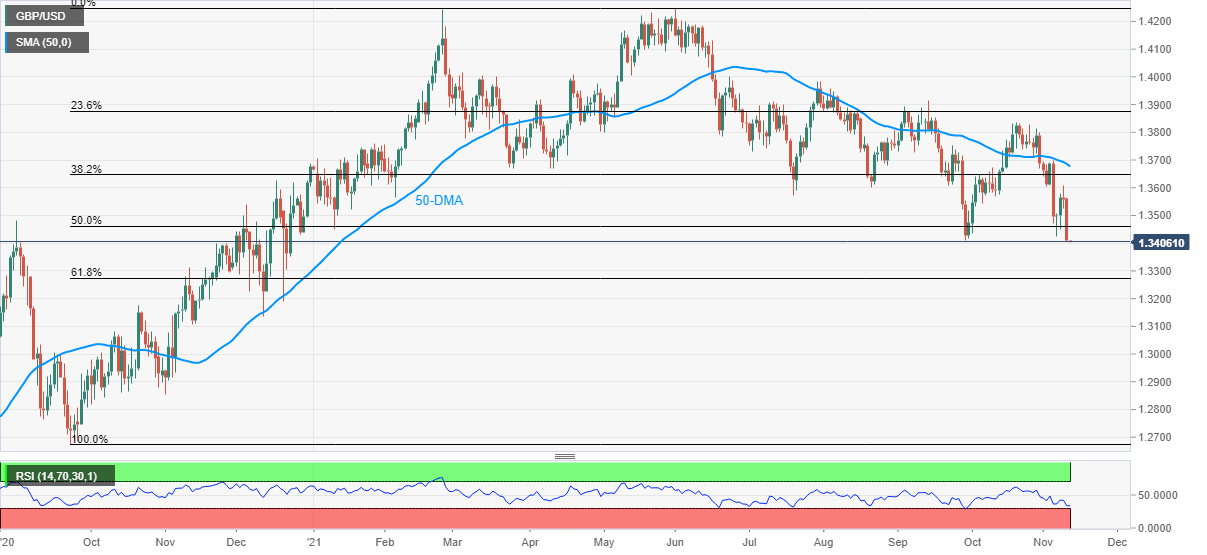 Meanwhile, a clear downside break of the 1.3400 mark will direct the GBP/USD prices towards December 2020 low near 1.3130, with the 61.8% Fibo. likely offering an intermediate halt around 1.3270.