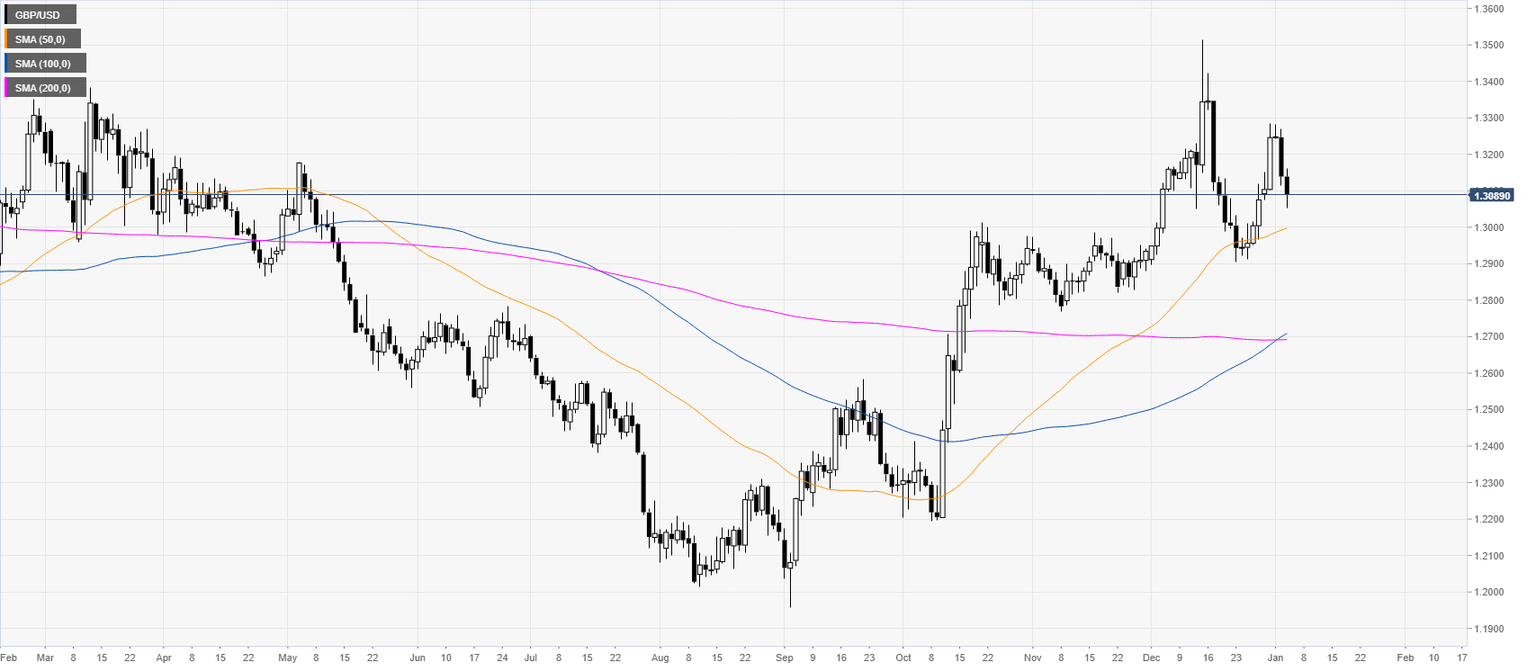 GBP/USD is starting 2020 by retracing down rejecting the 1.3300 handle. As the market seems to create a lower high, the correction down could extend towards the 1.3000 and 1.2900 handles. The FOMC at 19:00 GMT can lead to high volatility in USD-related currency pairs.
