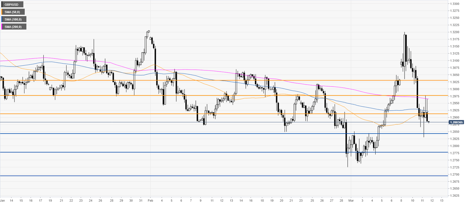 GBP/USD is reversing down while challenging the 1.2900 figure and trading below the main SMAs on the four-hour chart. As the market is spiking down, on a break below 1.2846, it is likely the bears will extend the move down towards the 1.2780 and 1.2700 support levels. Bullish attempts could find resistance near the 1.2913 and 1.2980 resistances according to the