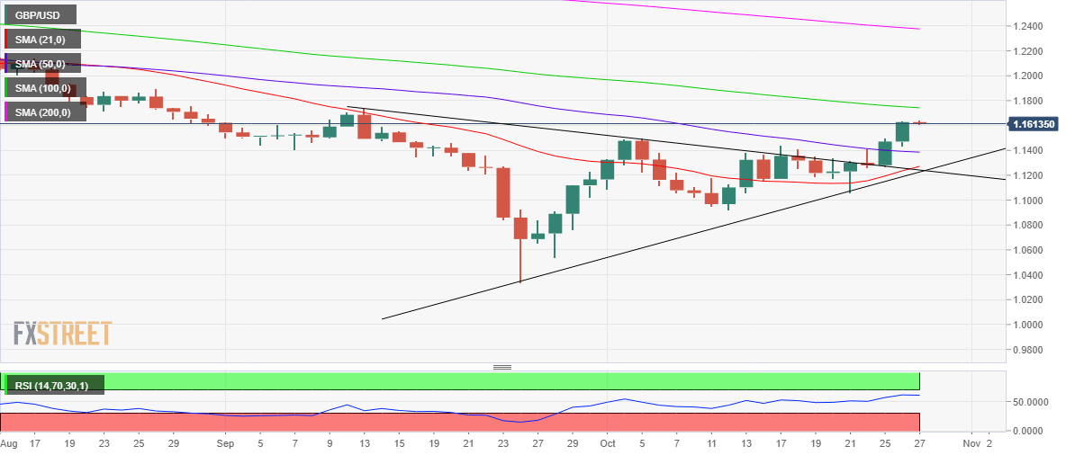 GBP/USD is treading water above 1.1600, pausing a two-day uptrend amid a cautious market mood. The US dollar is finding its feet, as investors seek refuge in the safe haven ahead of the critical ECB rate hike decision and the US advance Q3 GDP release.