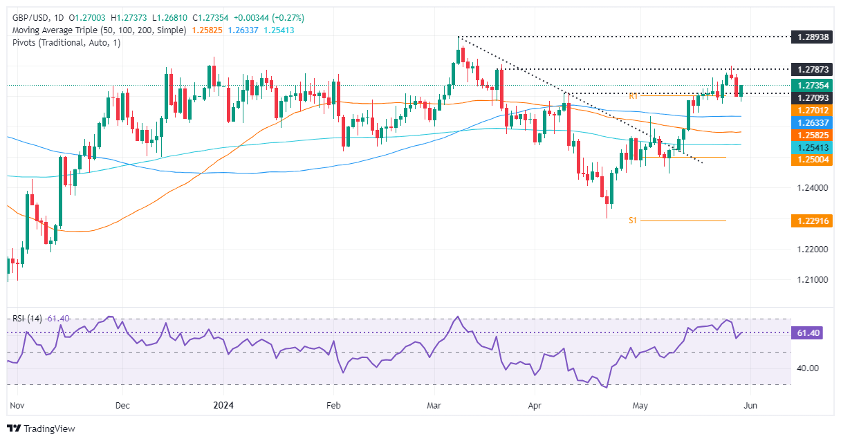 The daily chart suggests the GBP/USD is neutral to upward bias, but the buyer's failure to crack the March 21 daily high at 1.2803 opened the door for a pullback. Although momentum remains bullish, as shown by the Relative Strength Index (RSI), buying pressure begins to fade after testing 1.2800.