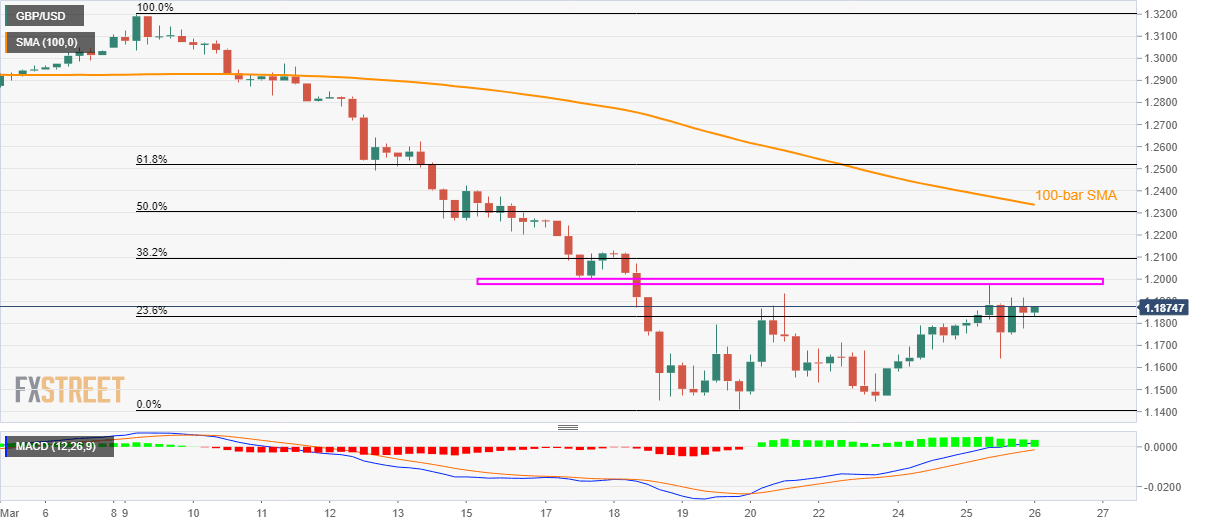 While extending its recent recovery, GBP/USD marks 1.1870 as a quote, down 0.07%, amid the Asian session on Thursday. In doing so, the pair inches closer to the short-term horizontal resistance amid the bullish MACD conditions.