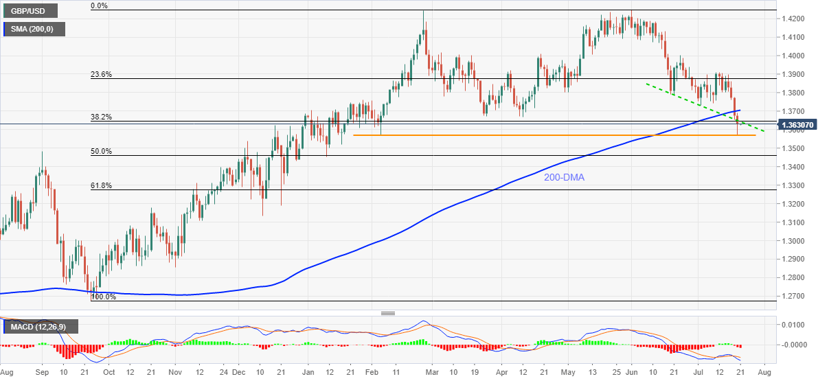 GBP/USD picks up bids to 1.3630, consolidate losses around a five-month low, amid Wednesday’s Asian session. In doing so, the cable pair confronts previous support stretched from June while keeping the downside break of 200-DMA amid bearish MACD.