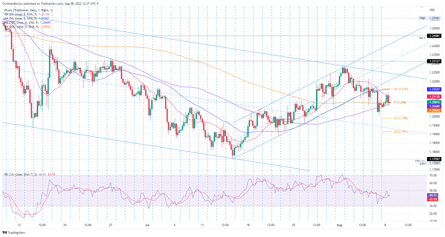 The GBP/USD daily chart illustrates the major as neutral-to-downward biased. Further confirmation of the previously mentioned is that sellers are gathering momentum, as shown by the Relative Strength Index (RSI), aiming lower, residing below the 50-midline. Also, the major trades within a descending channel and the spot price is 50 pips shy of the 20-day EMA at 1.2039. Once cleared, it would exacerbate a fall towards the bottom of the channel, near the YTD low at 1.1759.