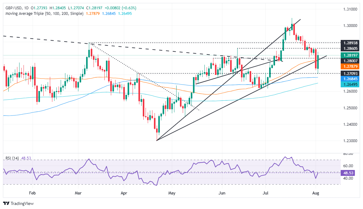 After diving throughout the week, the GBP/USD reclaimed key resistance levels like the 50-day moving average (DMA) at 1.2787 and the 1.2800 mark. Momentum shifted in buyers' favor as the Relative Strength Index (RSI) turned bullish