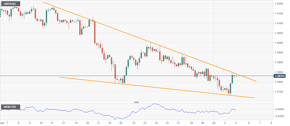 GBP/USD Price Analysis: Seesaws above 1.3800 inside monthly falling wedge
