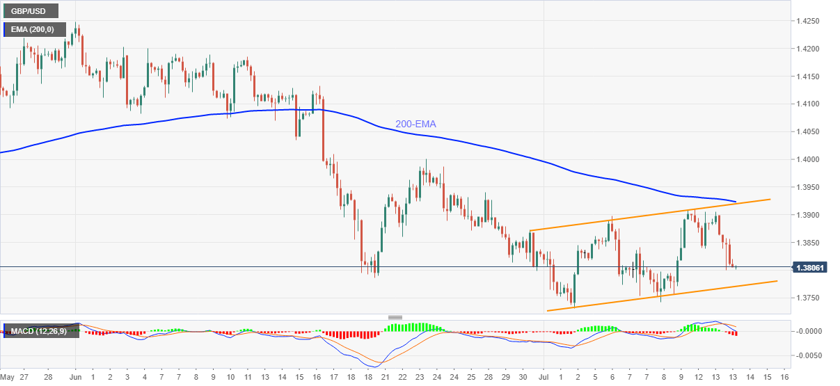 GBP/USD remains offered around 1.3800, down 0.07% intraday, amid Wednesday’s Asian session. In doing so, the cable pair drops for the third consecutive day inside an eight-day-old rising channel bullish formation.