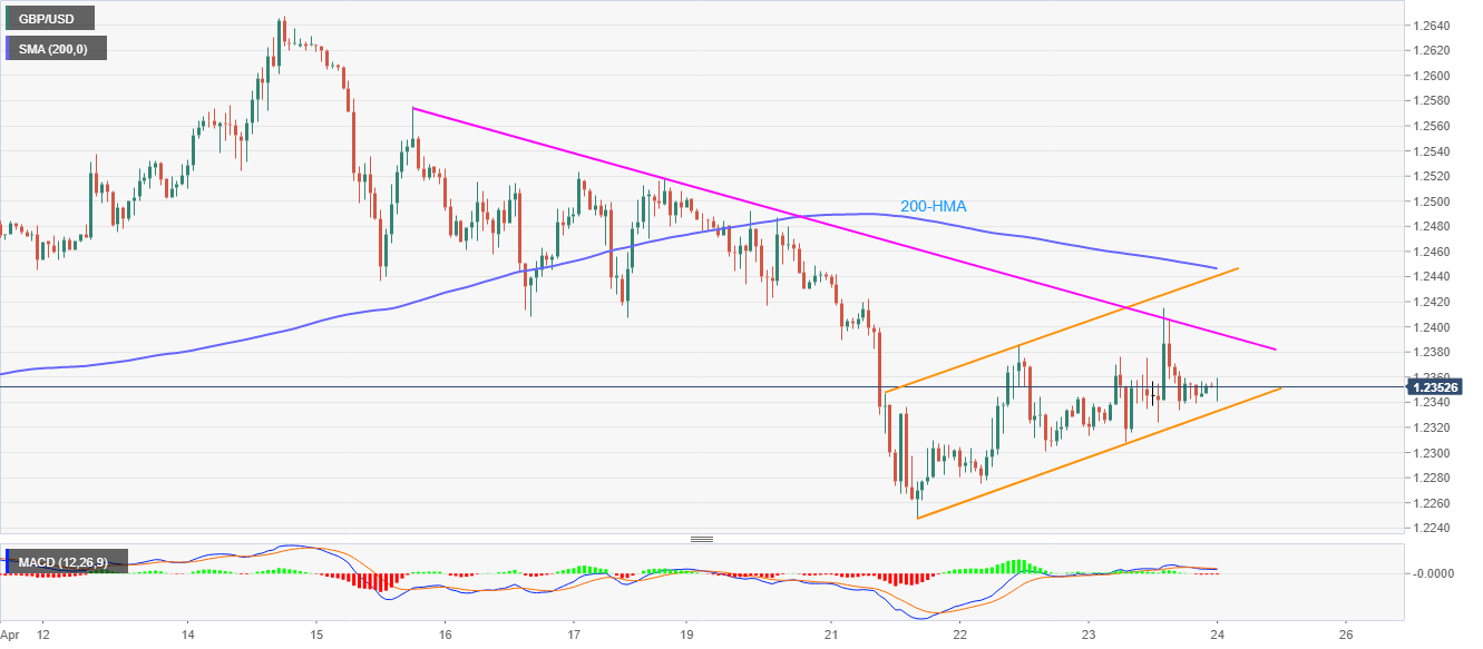 GBP/USD remains modestly changed near 1.2350 amid the Asian session on Friday. That said, the pair stays below 200-HMA and a seven-day long falling trend line but inside a short-term rising trend channel.