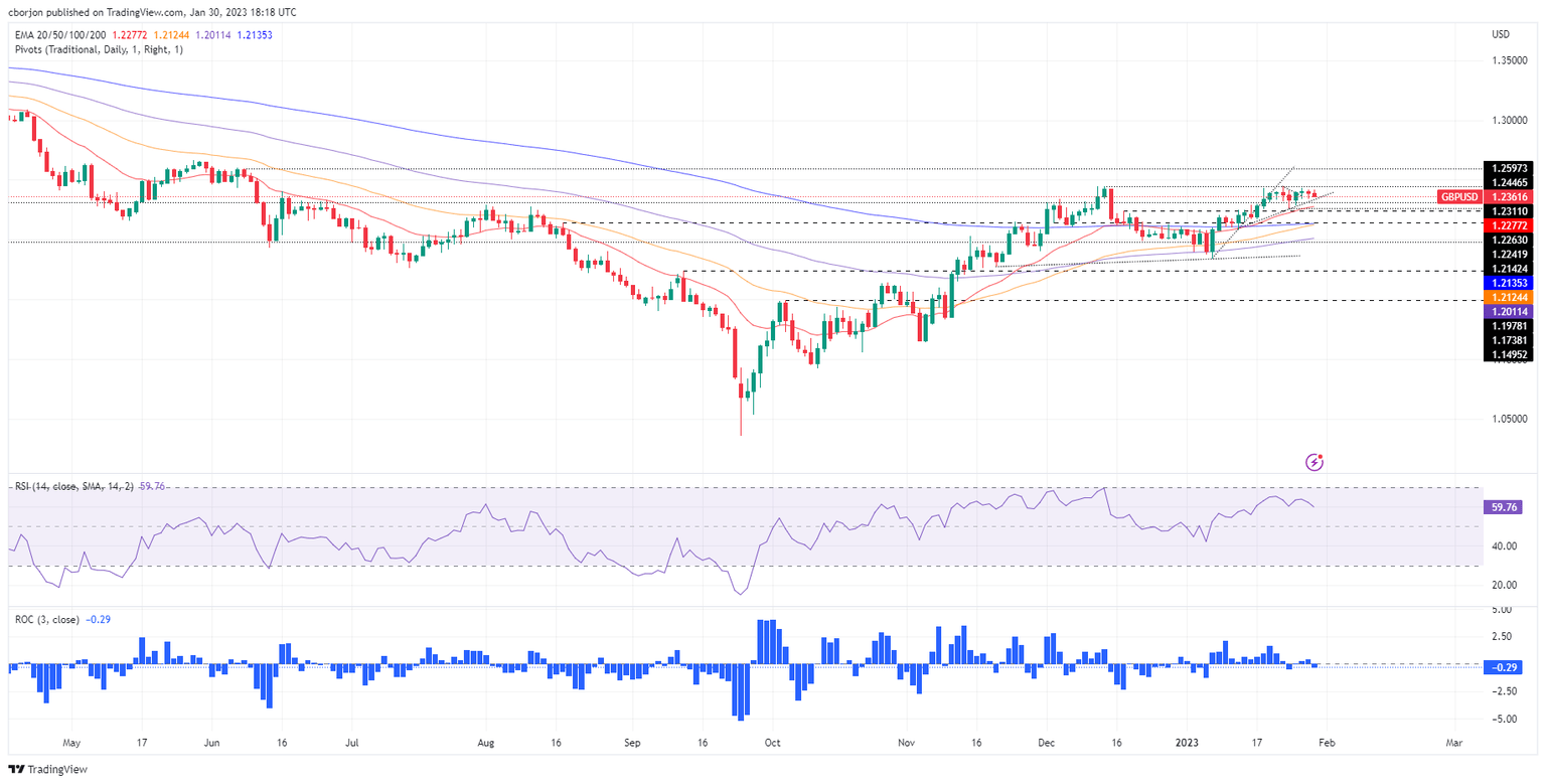 GBP/USD losses ground in the New York session, ahead of a busy week in the global economic docket, with major central banks hosting monetary policy decisions. The US Federal Reserve (Fed) is expected to raise rates by 25 bps, while the Bank of England (BoE) would likely lift rates by 50 bps, with analysts estimating that after February’s decision, the BoE would pause. At the time of writing, the GBP/USD is trading at 1.2367.