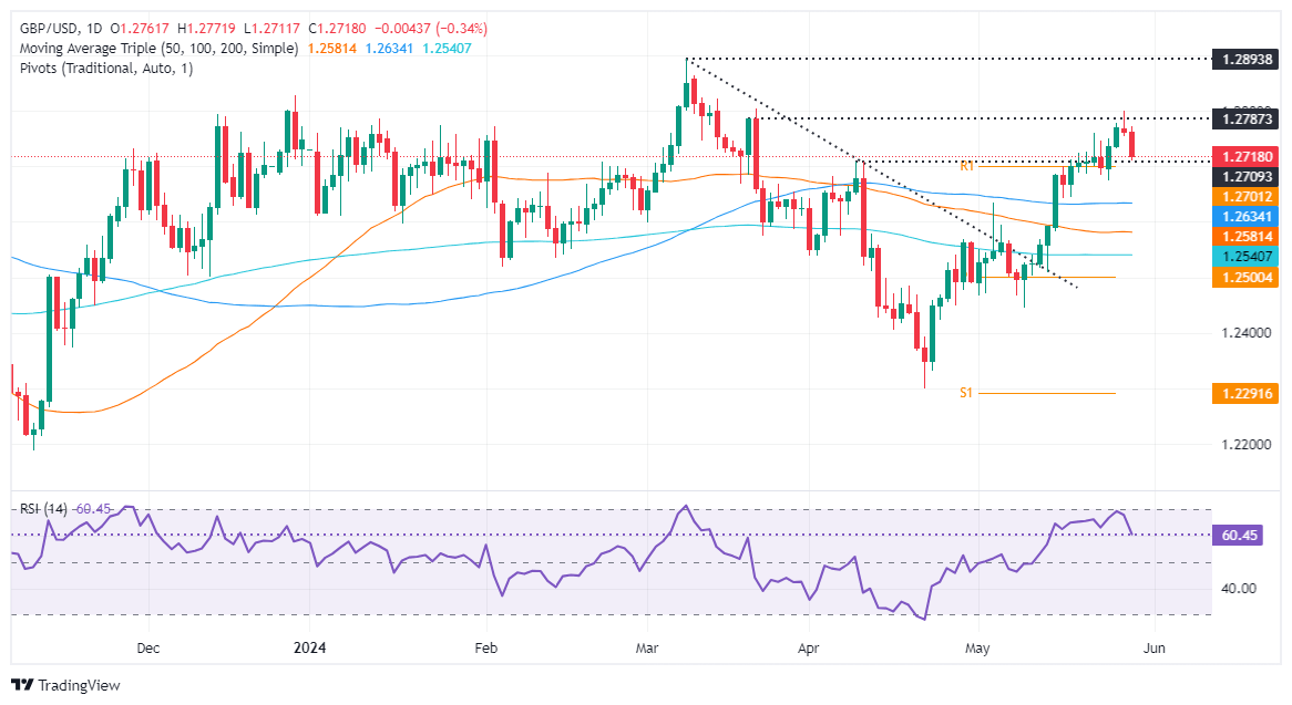 The British Pound fell to a new weekly low against the Greenback on Wednesday as US Treasury bond yields continued to climb. Federal Reserve officials remained cautious and influenced traders' expectations of just 25 basis points of rate cuts seen toward the end of 2024. The GBP/USD trades at 1.2719, down 0.33%.