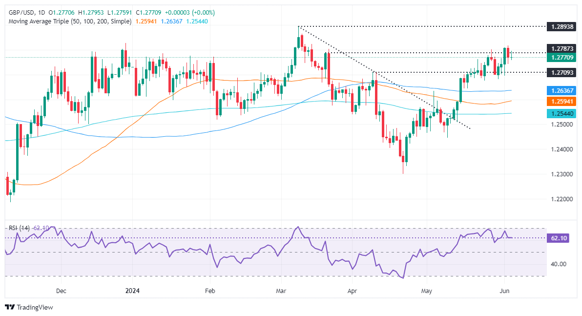 The GBP/USD is virtually unchanged in early trading during the North American session, following the release of the Institute for Supply Management (ISM) Services PMI, which showed the economy remains resilient, expanded in May above estimates and the previous month's reading, contrarily to manufacturing activity. Therefore, the major trades at 1.2768, almost flat.