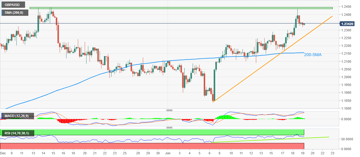 That said, a five-week-old horizontal resistance area restricts the GBP/USD pair’s immediate upside to around 1.2450 while an ascending trend line from January 06, close to 1.2260 at the latest, challenges the bears.