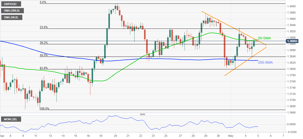 GBP/USD picks up bids around 1.3895, up 0.05% on a day, during Wednesday’s Asian session. In doing so, the cable keeps recent recovery moves to challenge the immediate upside hurdle, namely 50-SMA and short-term triangle resistance.