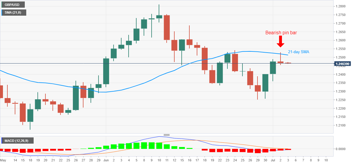 GBP/USD takes rounds to 1.2470 amid Friday’s Asian session. The Cable turned south from over one-week top the previous day, which in turn portrayed a bearish pin bar candlestick formation on the daily chart. Also favoring the sellers is the pair’s sustained trading below 21-day SMA and MACD signals.
