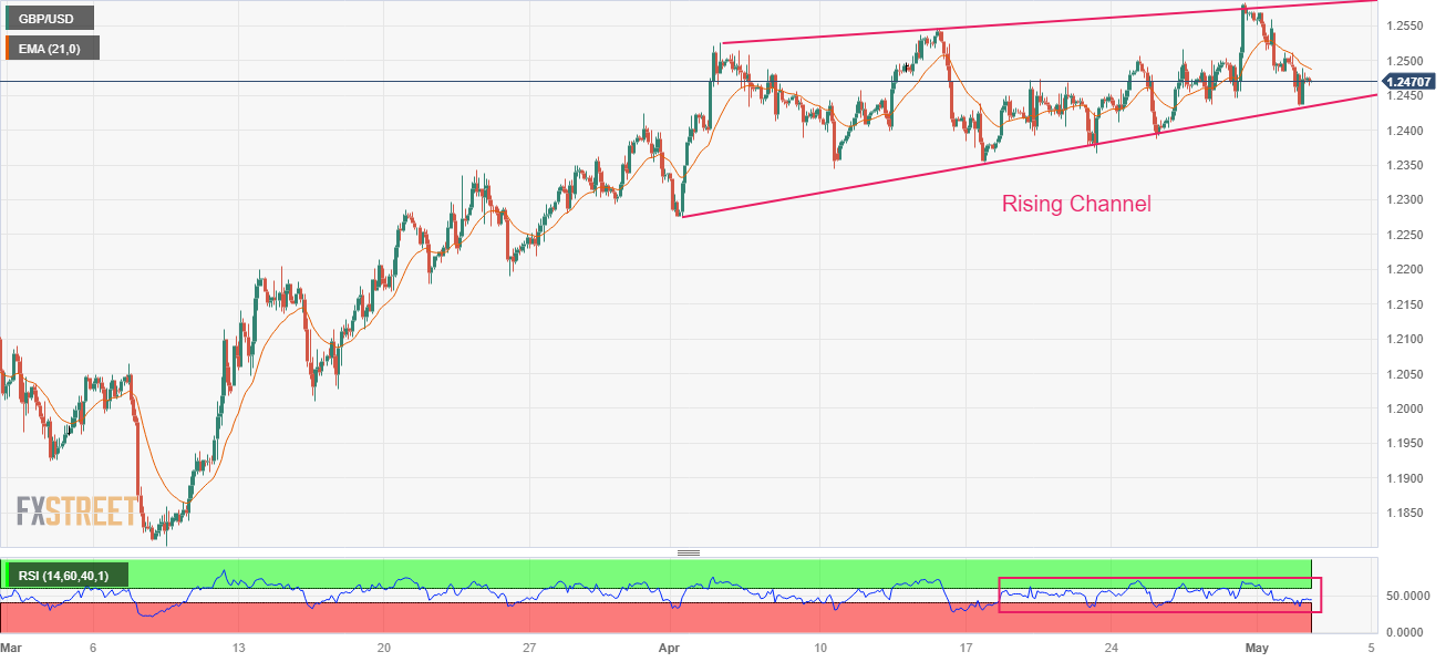 GBP/USD is auctioning in a Rising Channel chart pattern on a two-hour scale. The current variation of the Rising Channel lacks strength and is signaling a loss in the upside momentum. The upper portion of the aforementioned chart pattern is plotted from April 04 high at 1.2525 while the lower portion is placed from April 03 low at 1.2275.