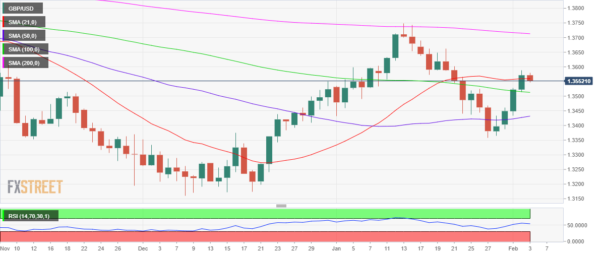 GBP/USD is battling 1.3550, looking to extend its retreat from an eight-day top of 1.3587, as the US dollar bulls jump onto the bids amid a risk-off market mood.