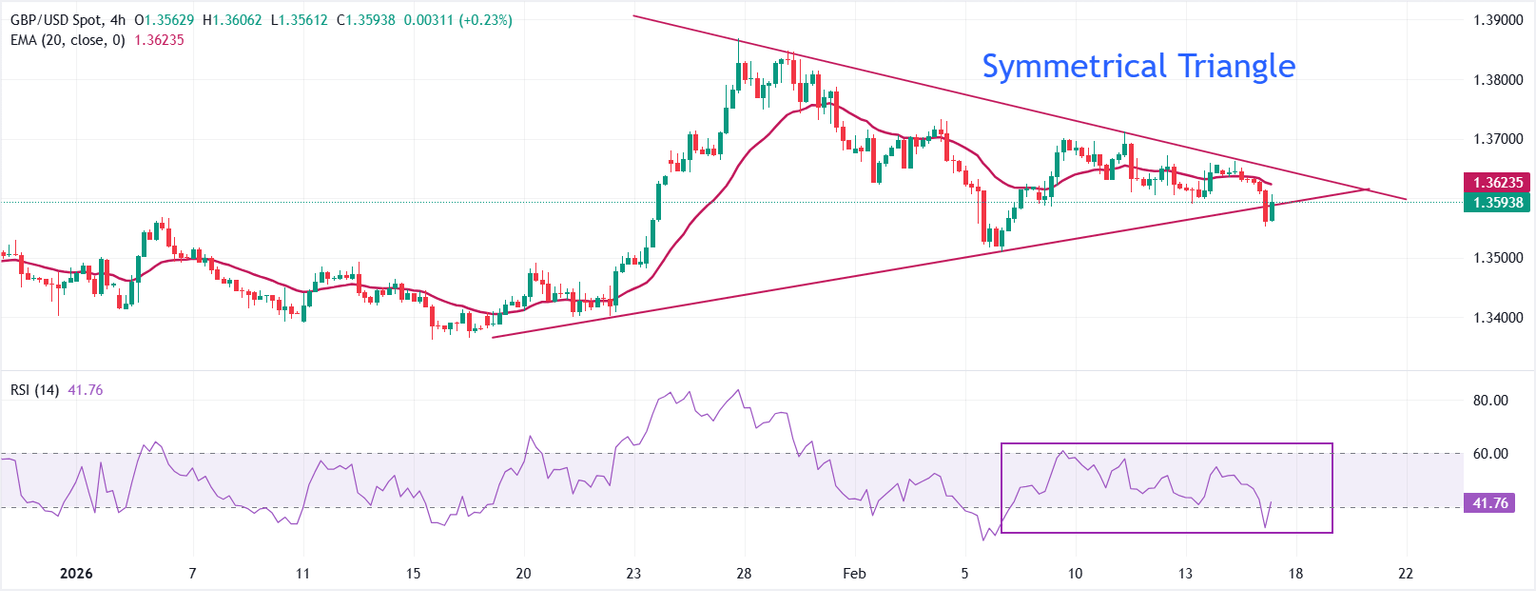 GBP/USD trades lower at 1.3594 at the press time. Price sits beneath the 20-period Exponential Moving Average (EMA) at 1.3624. The average edges lower, underscoring a soft short-term bias.