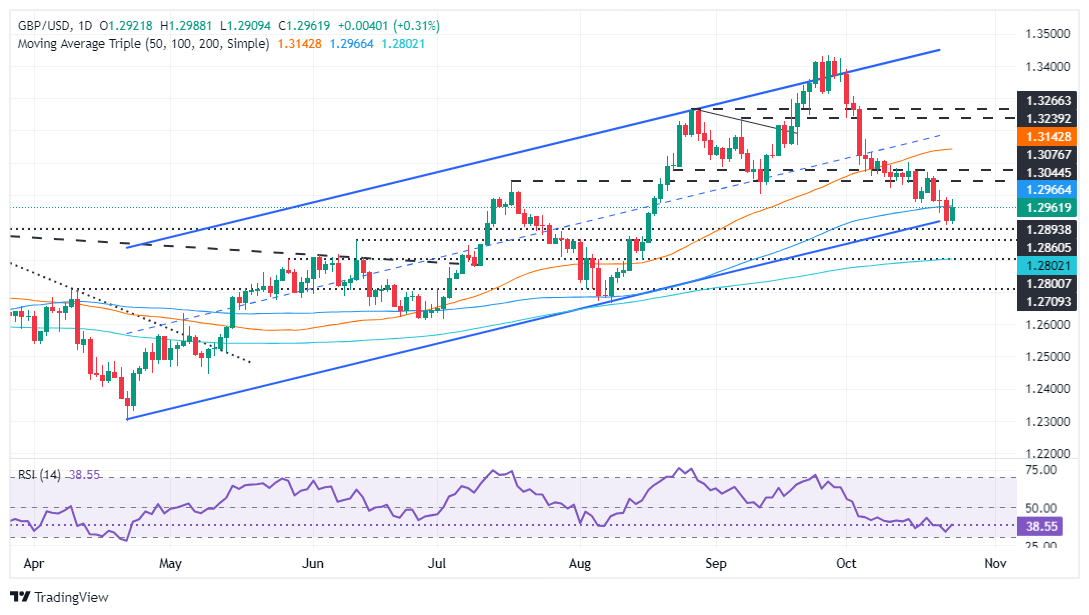 The GBP/USD bounced off the bottom trendline of an ascending channel after hitting a two-month low of 1.2907. Since then, the pair recovered some ground and hit a high of 1.2987, before struggling to sustain the advance above the 100-day Simple Moving Average (SMA) at 1.2964.