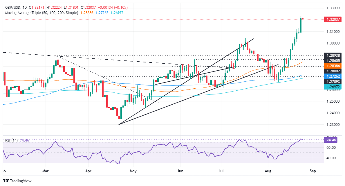 Momentum shows buyers are losing steam as the Relative Strength Index (RSI) remains overbought. Therefore, if the GBP/USD achieves a daily close below 1.3200, that could pave the way for a deeper pullback.