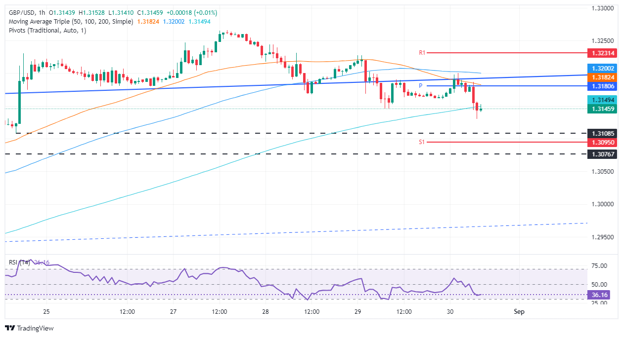 Zooming into the hourly chart, the GBP/USD is bearishly biased, as the exchange rate remains below the 50, 100, and 200-hour moving averages (HMAs), with sellers eyeing last Friday's low of 1.3108. Once cleared could pave the way for testing the 1.3100 figure. A further downside is seen at the August 22 swing low of 1.3076, ahead of the August 20 high at 1.3052.