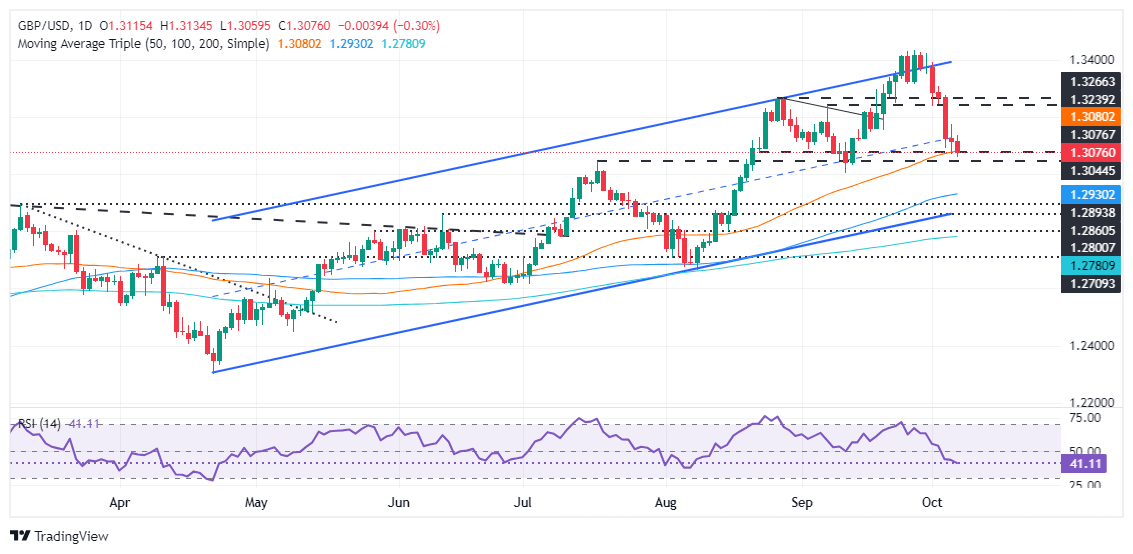 - Bearish RSI indicates seller dominance; key supports are at the 50-DMA of 1.3077, 1.3031, and 1.3001.