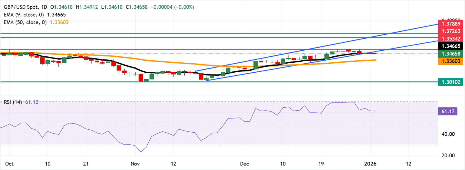 GBP/USD edges higher on the first day of the year, trading around 1.3470 during the Asian hours on Friday. The technical analysis of the daily chart indicates a weakening of a bullish bias as the pair remains slightly below the lower boundary of the ascending channel pattern.
