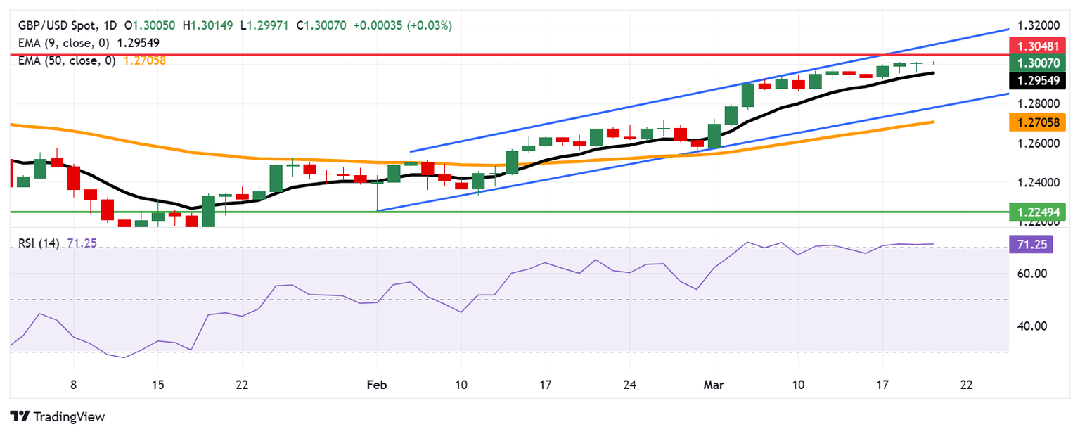 The GBP/USD pair remains in positive territory for the fourth successive session, trading around 1.3010 during the Asian hours on Thursday. Technical analysis of the daily chart indicates a continued bullish bias, with the pair moving upwards within an ascending channel pattern.