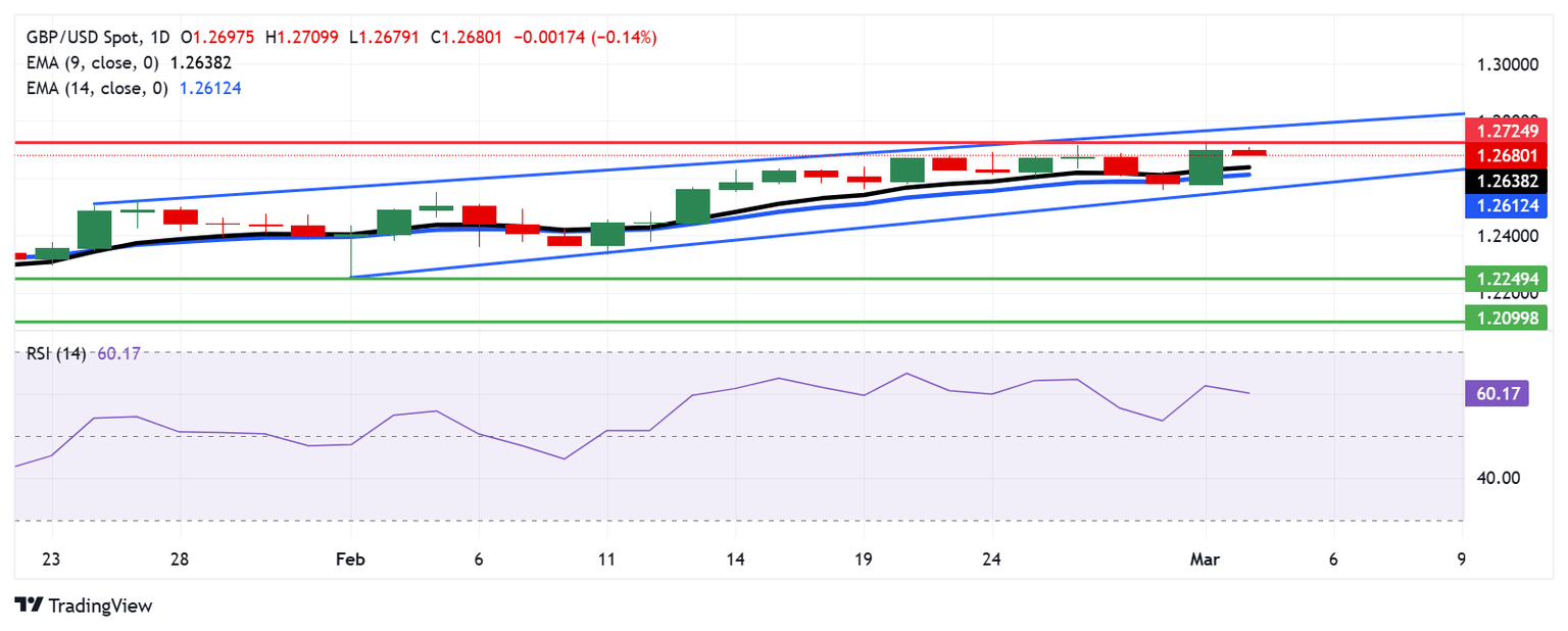 The GBP/USD pair edges lower after registering gains in the previous session, hovering around 1.2680 during Tuesday’s Asian hours. Technical analysis of the daily chart suggests a continued bullish bias, with the pair maintaining its position within an ascending channel pattern.
