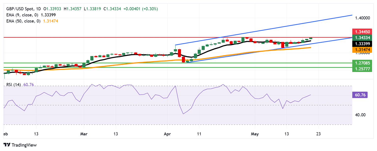 The GBP/USD pair extends its winning streak for the third successive session, trading around 1.3430 during Wednesday's Asian hours. The technical analysis of the daily chart suggests a persistent bullish bias as the pair remains within an ascending channel pattern.