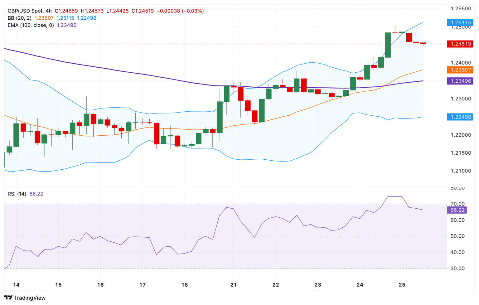 According to the 4-hour chart, the bullish outlook of GBP/USD prevails as the major pair is above the key 100-period Exponential Moving Average (EMA). The upward momentum is reinforced by the Relative Strength Index (RSI), which stands above the midline around 64.70, indicating that further upside looks favorable.