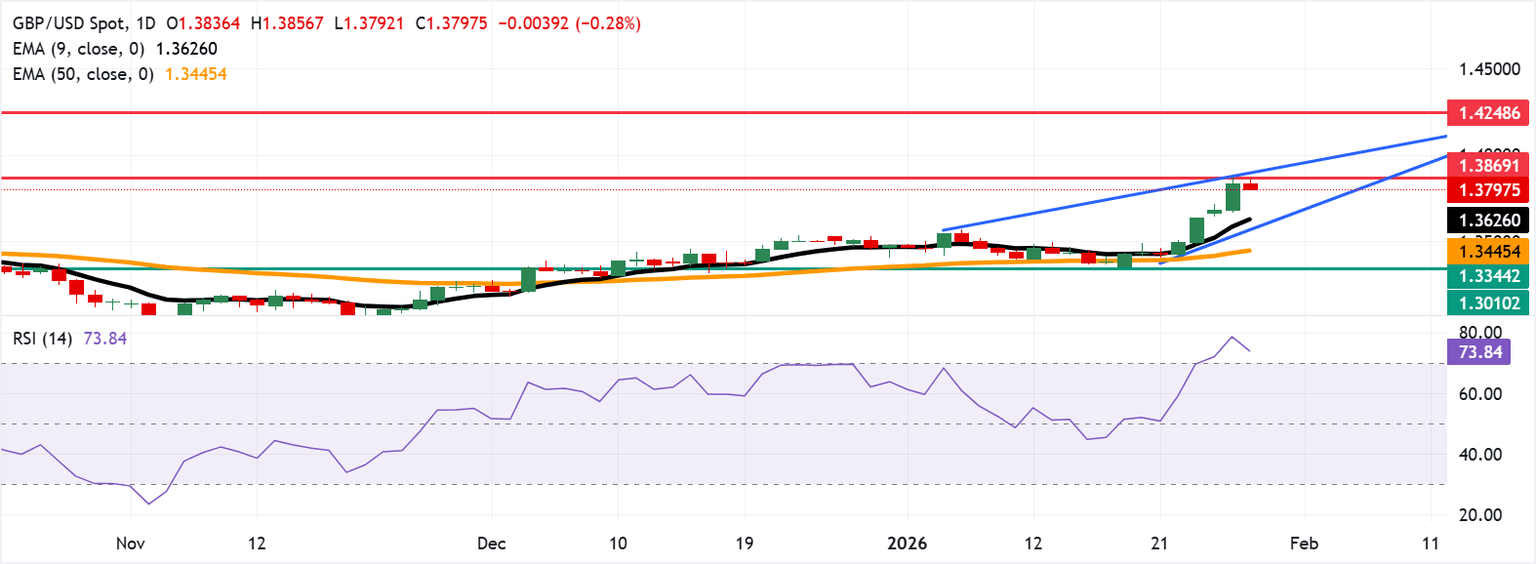 GBP/USD Price Forecast: Trades below 1.3800 after pulling back from four-year highs